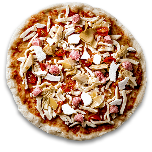 Tomate, mozzarella fior di latte, alcachofas, queso de cabra, tomate cherry y salchichas